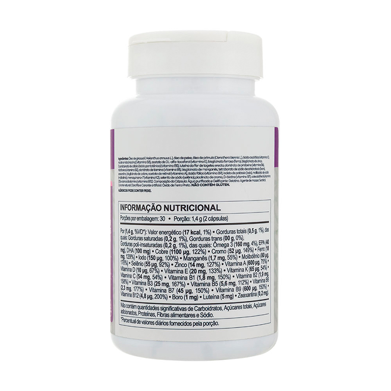 Suplemento multivitamínico composto por vitaminas A, C, D, E, K, complexo B, ômega 3, cobre, cromo, ferro, iodo, molibdênio, manganês, boro, selênio, zinco, luteína e zeaxantina